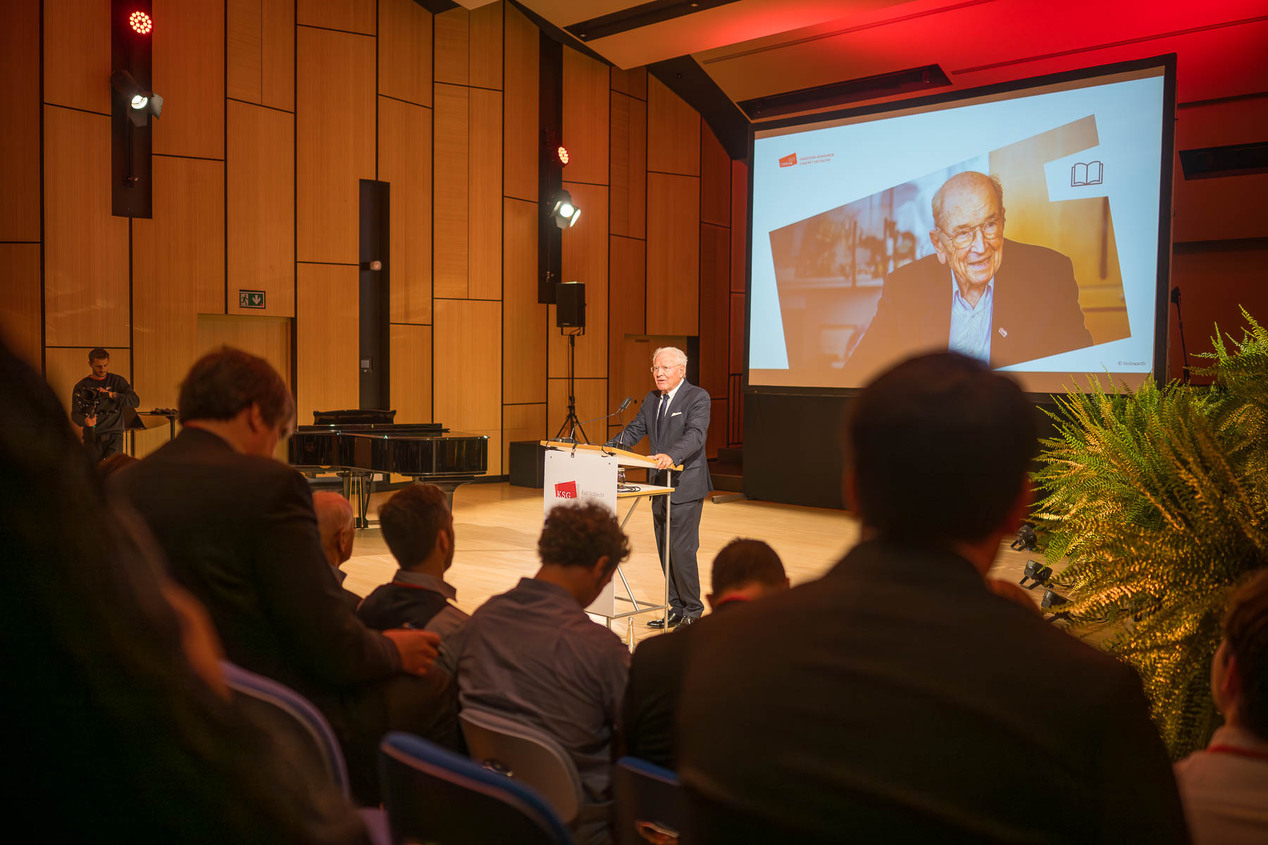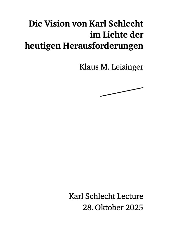Prof. Dr. Dres. h.c. Klaus Leisinger, der Vorsitzende des Kuratoriums der Stiftung und langjährige Wegbegleiter des Stifters, hielt am 28. Oktober 2025 die erste Karl Schlecht Lecture zum Thema „Die Vision von Karl Schlecht im Lichte der heutigen Herausforderungen“.